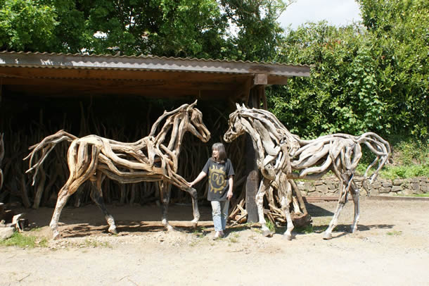 Artista britanica Heather Jansch (nascuta Heather Rosemary Sewell) creează adevărate opere de artă din lemnele pe care le găseşte pe plaja din apropierea casei sale, lemne care prind viata sub atingerea sa si se transforma in cai..